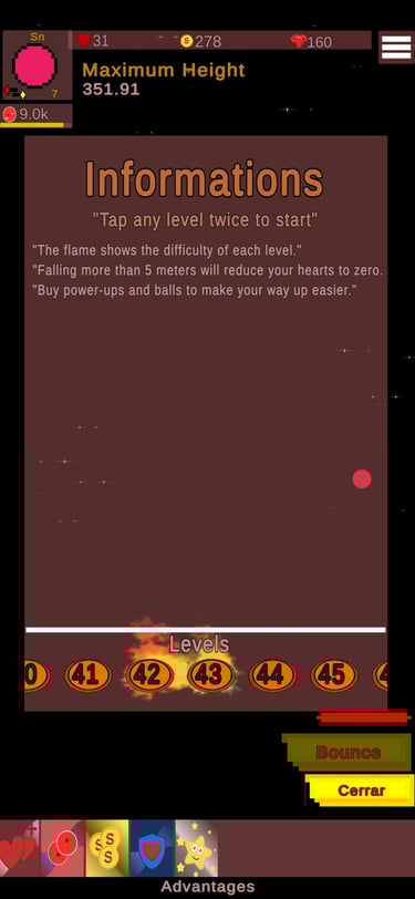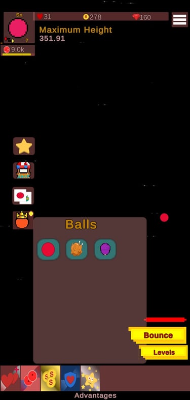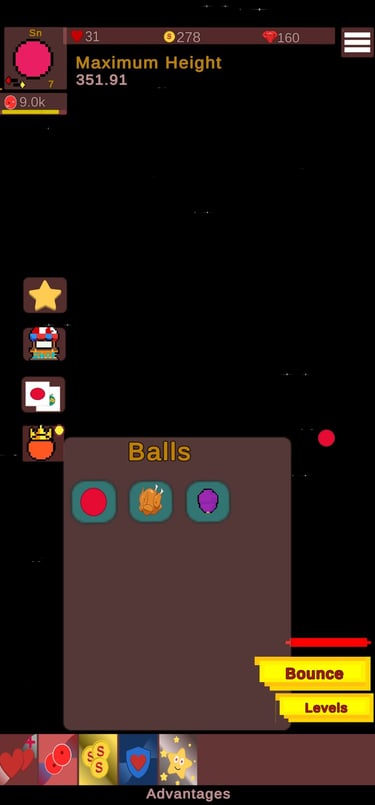 Elige entre diferentes bolas, cada una con habilidades únicas que se adaptan a tu estilo de juego. Ademas , puedes mejorar tus habilidades para sobrevivir mas tiempo, rebotar mas altos o esquivar obstáculos y enemigos.